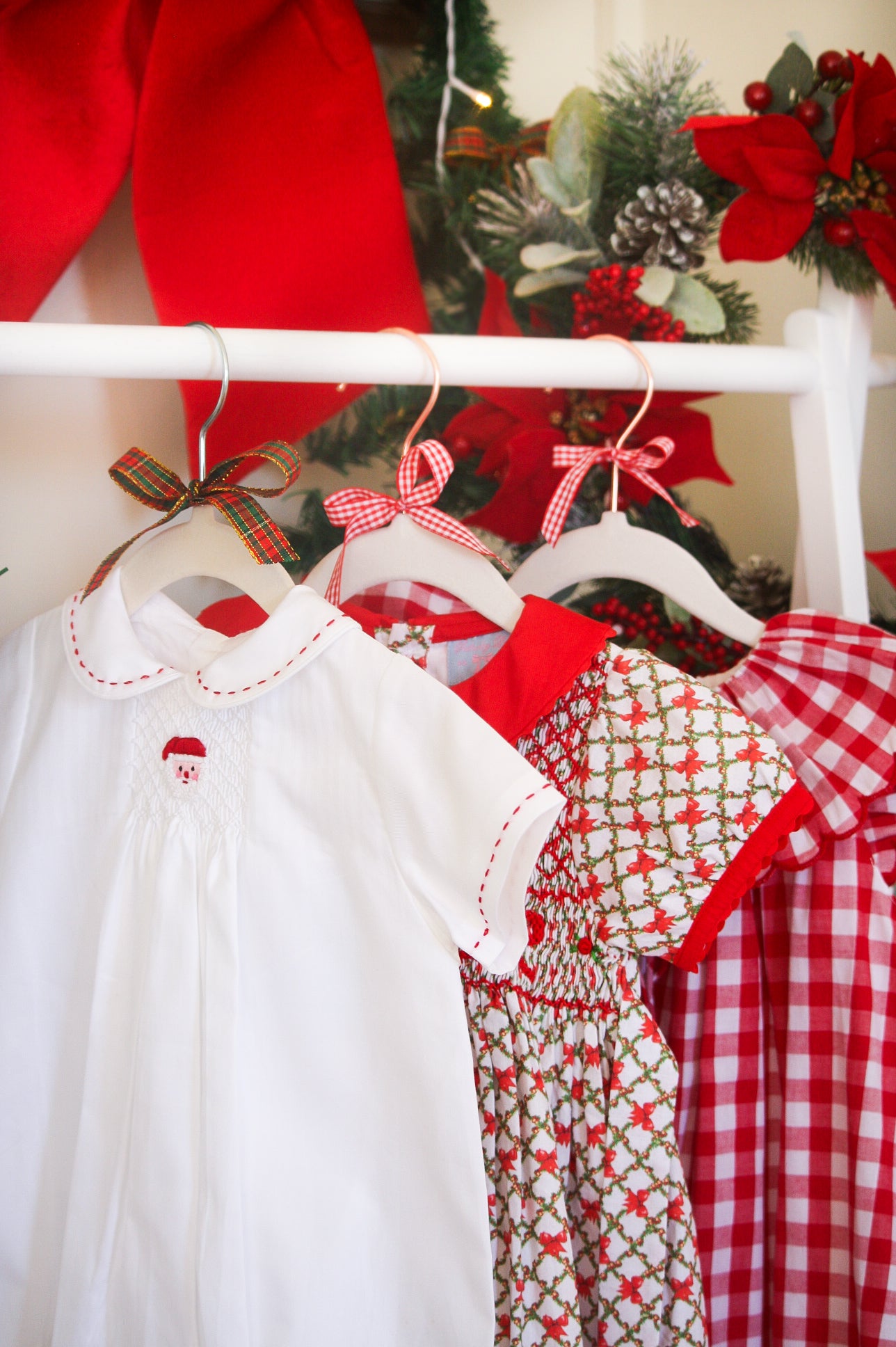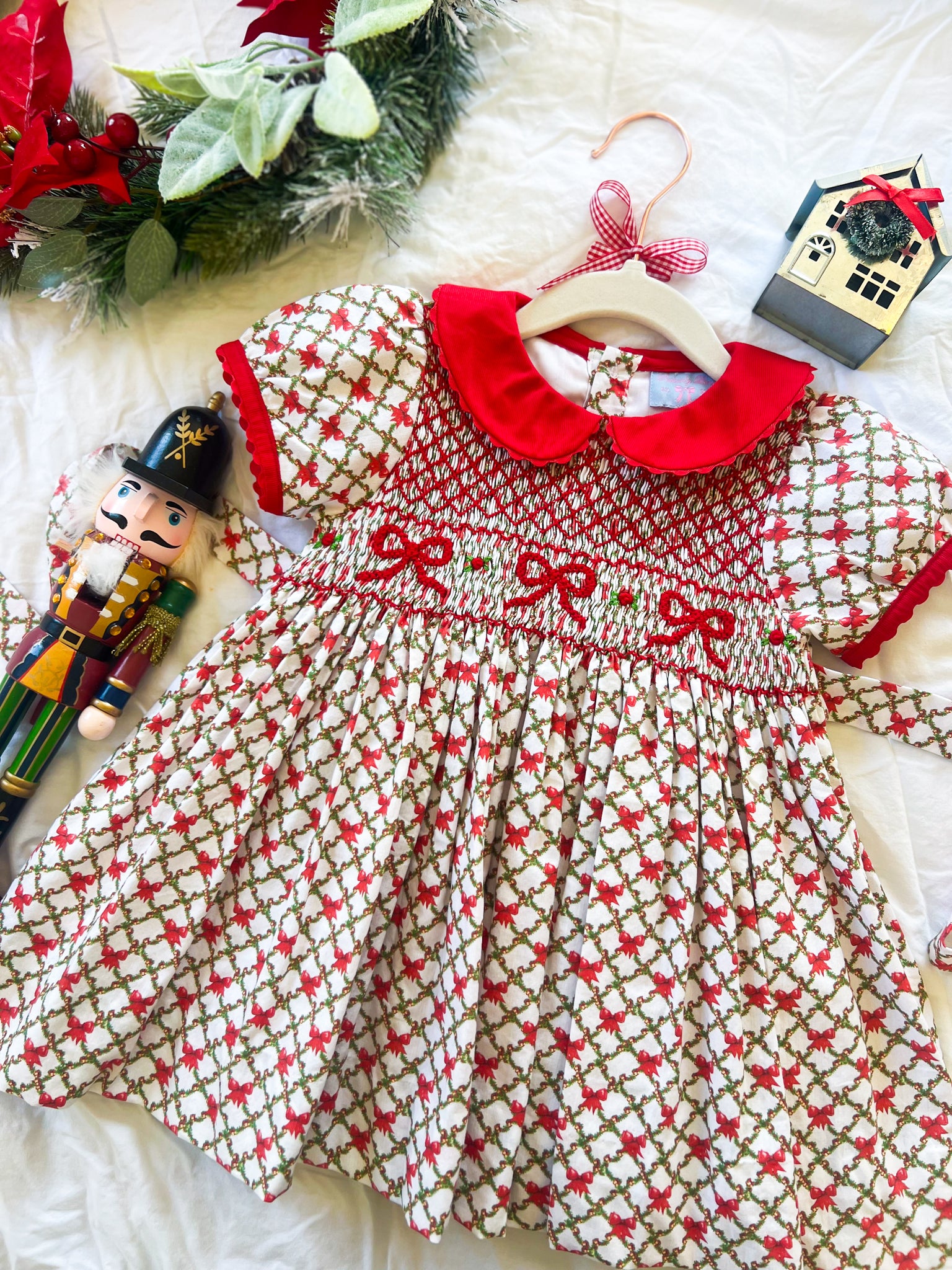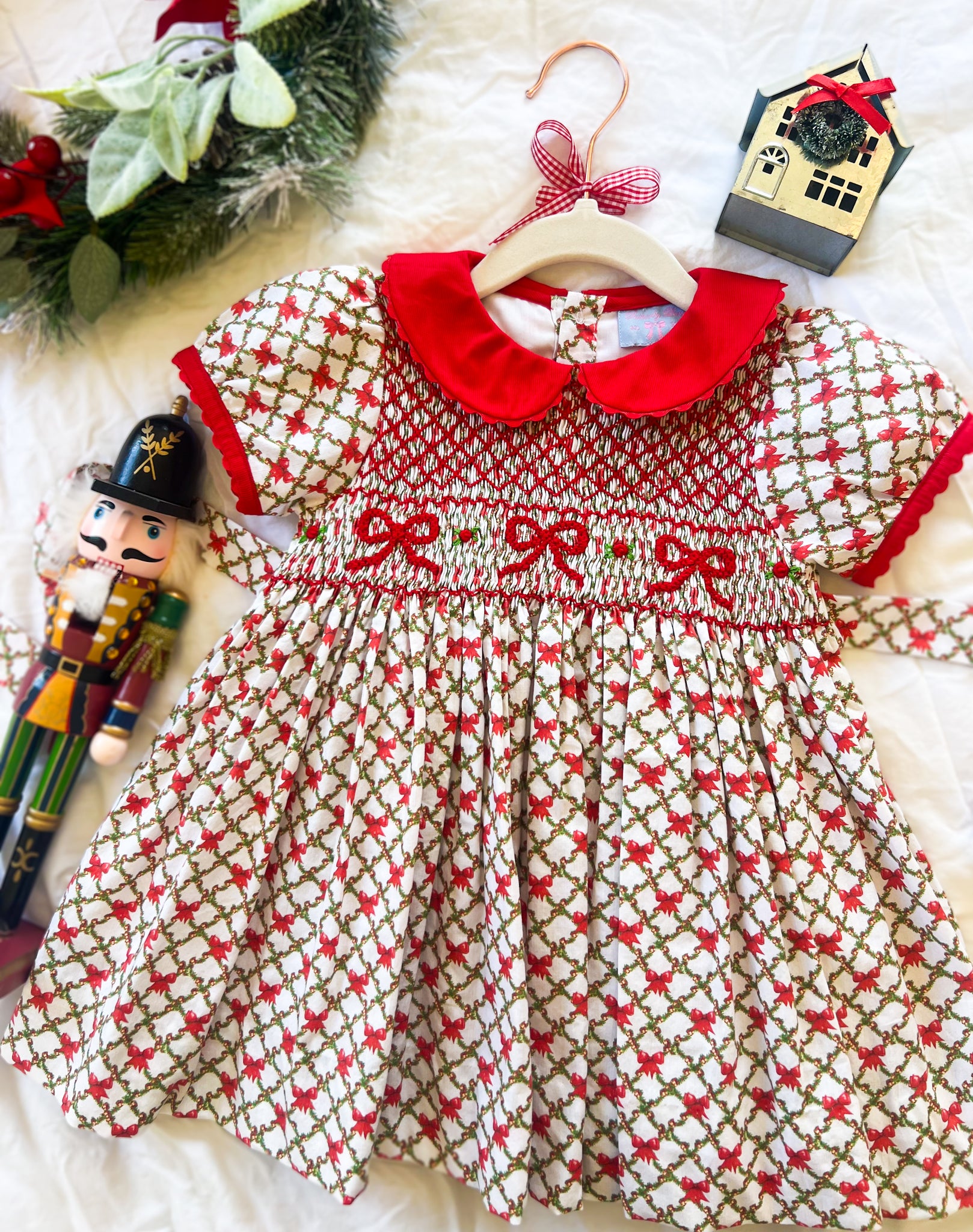 - Intricately hand-smocked bodice with rosettes and bows