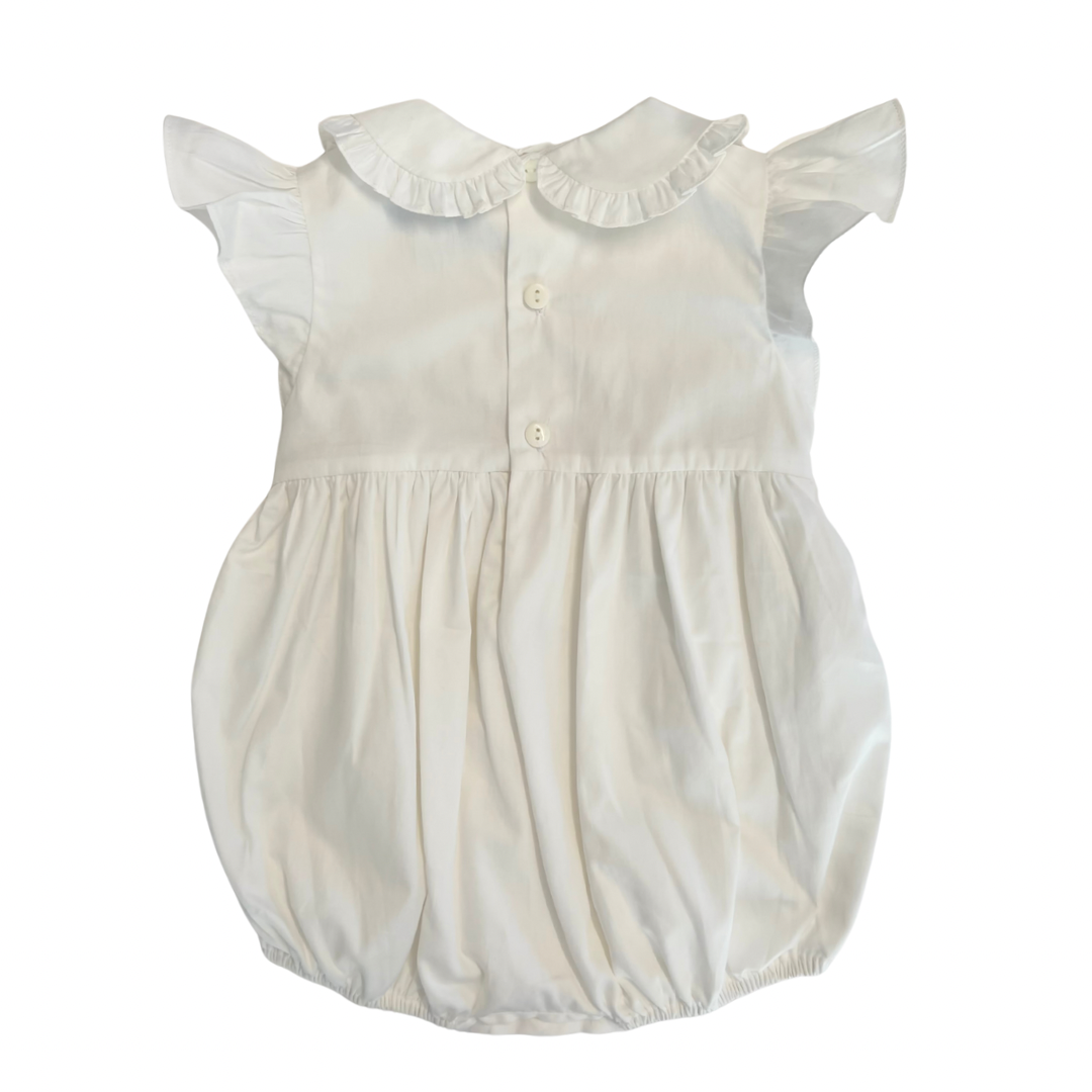 - Hand-smocked bodice with signature hand-embroidered bullion bow garland in dazzling gold threads